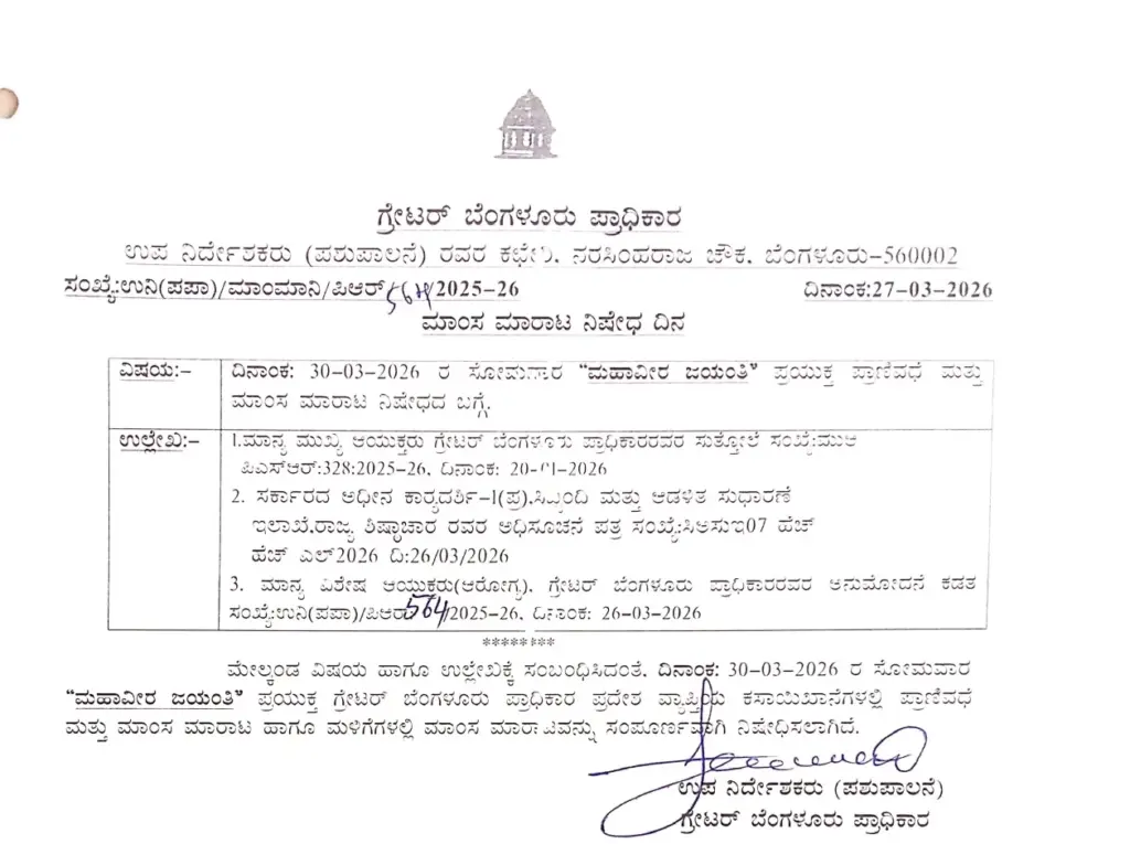 മഹാവീരജയന്തി ദിവസമായ ഇന്ന് ബെംഗളൂരുവിൽ കശാപ്പിനും ഇറച്ചിക്കച്ചവടത്തിനും നിരോധനം. ഗ്രേറ്റർ ബെംഗളൂരു അതോറിറ്റിയാണ് ഉത്തരവ് പുറപ്പെടുവിച്ചത്. ഇറച്ചിസ്റ്റാളുകളും കശാപ്പുശാലകളും അടച്ചിടാൻ ഉത്തരവിൽ നിർദേശിച്ചു. ഗ്രേറ്റർ ബെംഗളൂരു അതോറിറ്റിയുടെ കീഴിലുള്ള അഞ്ച് മുനിസിപ്പിൽ കോർപ്പറേഷനുകളുടെ പരിധിയിലും ഉത്തരവ് ബാധകമായിരിക്കും.