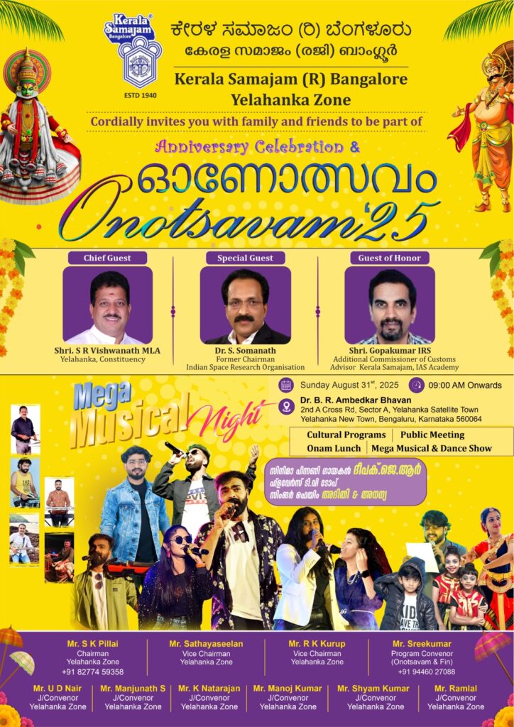 കേരളസമാജം ബാംഗ്ലൂർ യലഹങ്ക സോൺ ഓണാഘോഷം ഓഗസ്റ്റ് 31ന് യലഹങ്ക ഡോ.ബി.ആർ.അംബേദ്കർ ഭവനിൽ നടക്കും. മുൻ ഐഎസ്ആർഒ ചെയർമാൻ ഡോ.എസ്.സോമനാഥ് ഓണാഘോഷം ഉദ്ഘാടനം ചെയ്യും.