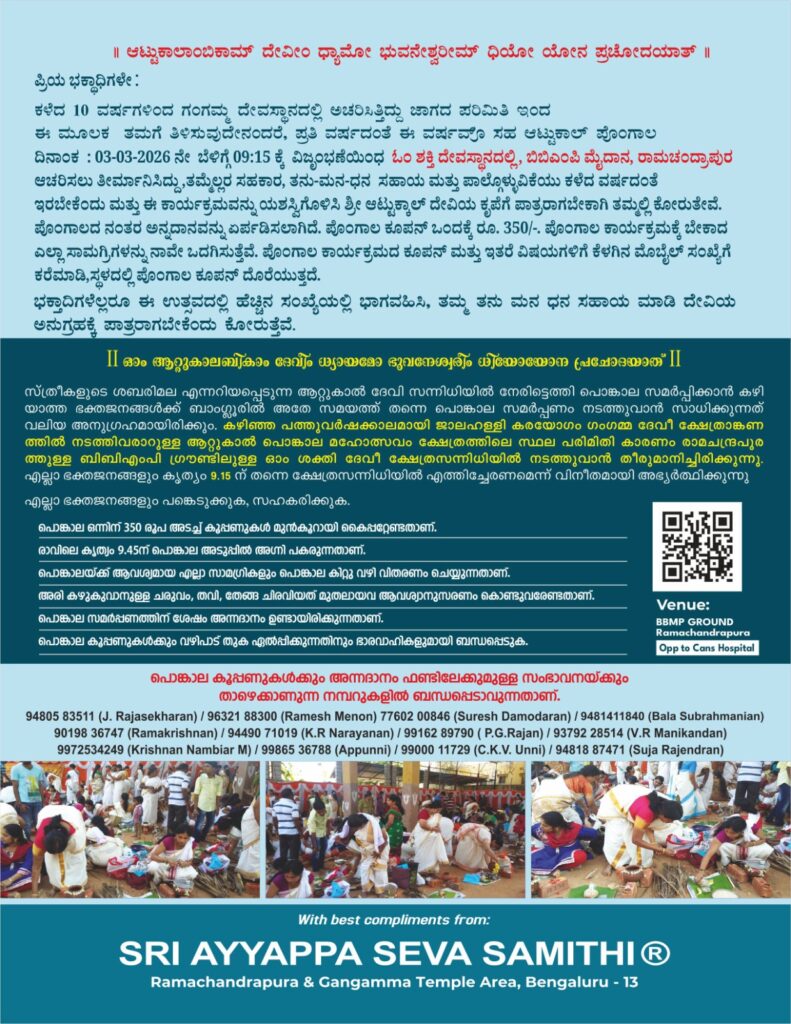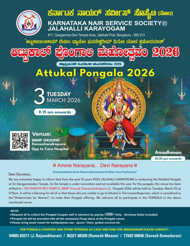 കർണാടക നായർ സർവീസ് സൊസൈറ്റി ജാലഹള്ളി കരയോഗത്തിൻ്റെ നേതൃത്വത്തിൽ ആറ്റുകാൽ പൊങ്കാല മഹോത്സവം മാർച്ച് 3ന് രാമചന്ദ്രപുരത്തുള്ള ബിബിഎംപി ഗ്രൗണ്ടിലുള്ള ഓം ശക്തിദേവി ക്ഷേത്രസന്നിധിയിൽ നടത്തും. കർണാടക റവന്യൂ മന്ത്രി കൃഷ്ണബയിരെ ഗൗഡയും സഹധർമ്മിണി മീനാക്ഷി ബയിരെ ഗൗഡയും പൊങ്കാല മഹോത്സവത്തിൽ പങ്കെടുക്കും.