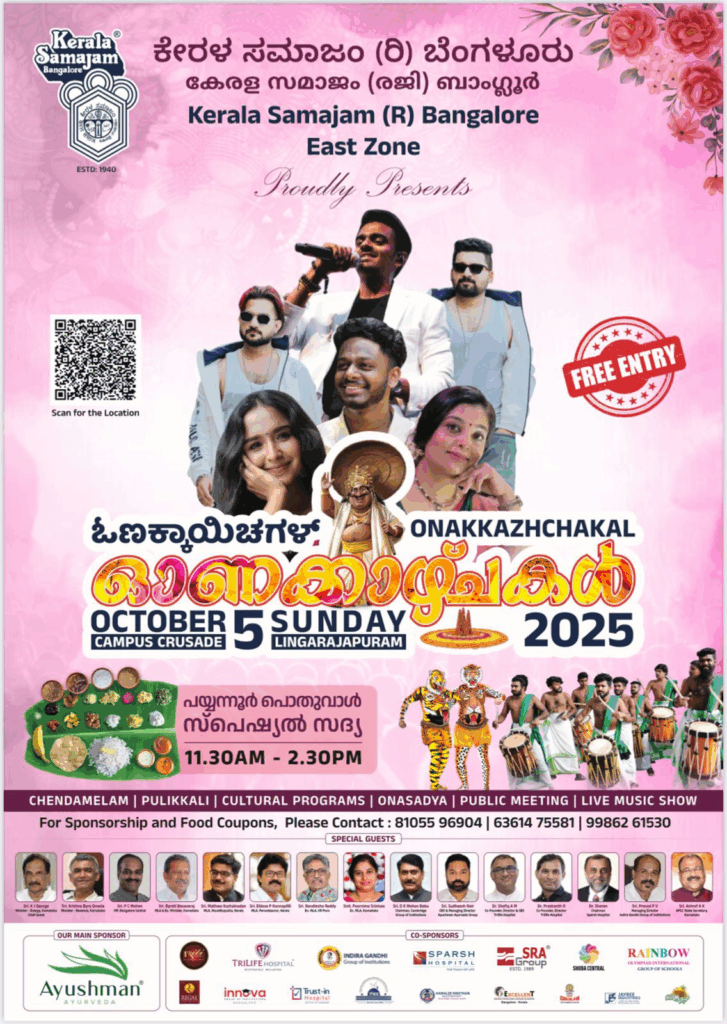 കേരള സമാജം ബാംഗ്ലൂർ, ഈസ്റ്റ് സോണിൻ്റെ ഓണാഘോഷം ‘ഓണക്കാഴ്ചകൾ’ നാളെ ലിംഗരാജപുരം കാമ്പസ് ക്രൂസേഡ് ഓഡിറ്റോറിയത്തിൽ വിവിധ പരിപാടികളോടെ ആഘോഷിക്കും. പൊതുസമ്മേളനത്തിൽ മന്ത്രിമാരായ കെ ജെ ജോർജ്, കൃഷ്ണബൈരഗൗഡ, പി സി മോഹൻ എം പി, ബി എ ബസവരാജ് എംഎൽഎ, മാത്യു കുഴൽനാടൻ എംഎൽഎ, എൽദോസ് പി കുന്നപ്പള്ളി എംഎൽഎ എന്നിവർ മുഖ്യാതിഥികൾ ആയിരിക്കും.