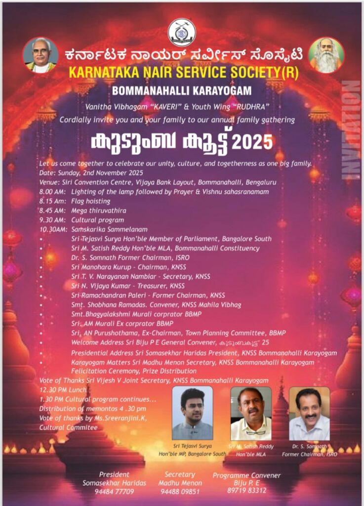 കർണാടക നായർ സർവീസ് സൊസൈറ്റിയുടെ ബൊമ്മനഹള്ളി കരയോഗത്തിൻ്റെ കുടുംബസംഗമം “കുടുംബ കൂട്ട് 2025” നവംബർ 2, ഞായർ 8 മണി മുതൽ ബൊമ്മനഹള്ളി വിജയ ബാങ്ക് ലേയൗട്ടിലുള്ള സിരി കൺവെൻഷൻ സെന്ററിൽ വെച്ച് കരയോഗം അംഗങ്ങളുടെ കലാപരിപാടികൾ, സാംസ്‌കാരിക സമ്മേളനം എന്നിവയോടുകൂടി നടത്തപ്പെടും.