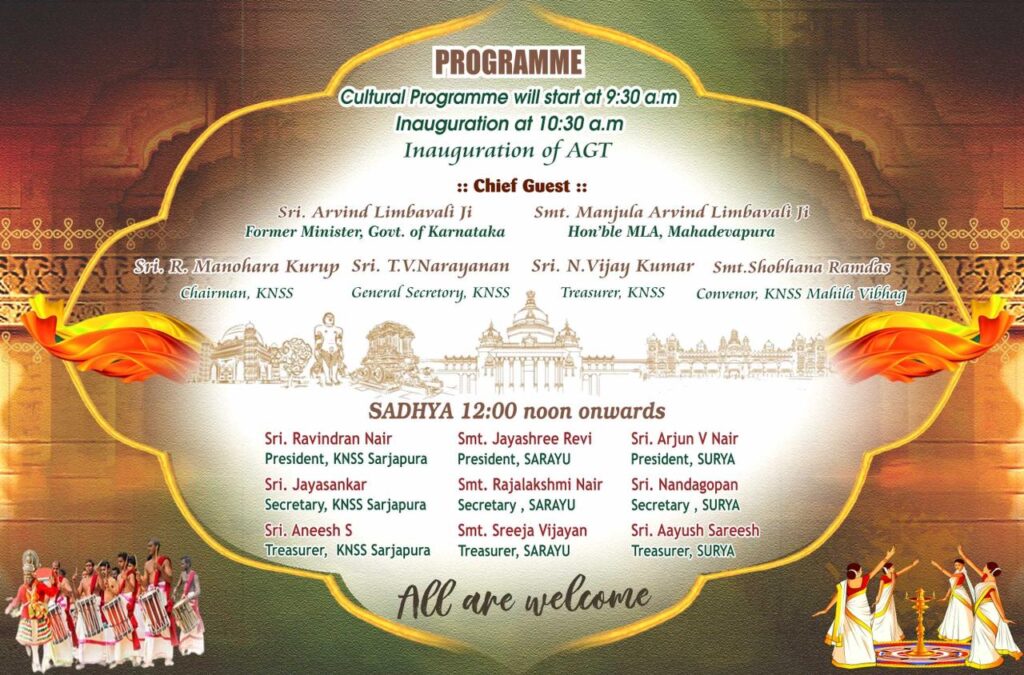 കരയോഗം പ്രസിഡണ്ട് രവീന്ദ്രൻ നായർ അദ്ധ്യക്ഷത വഹിക്കുന്ന ചടങ്ങിൽ കെ.എൻ.എസ്സ്.എസ്സ് ചെയർമാൻ ആർ.മനോഹരക്കുറുപ്പ് ഉദ്ഘാടനം ചെയ്യും. മഹാദേവപുര എംഎൽഎ മഞ്ജുള ലിംബാവലി, മുൻ മന്ത്രി അരവിന്ദ് ലിംബാവലി തുടങ്ങിയവർ മുഖ്യ അതിഥികളായിരിക്കും. കെ.എൻ.എസ്സ്.എസ്സ് ജനറൽ സെക്രട്ടറി ടി.വി.നാരായണൻ, ട്രഷറർ എൻ.വിജയകുമാർ, മറ്റു ഭാരവാഹികൾ, ബോർഡ് ഡയറക്ടറുമാർ, കരയോഗം പ്രതിനിധികൾ, മഹിളാ പ്രതിനിധികൾ, മറ്റു വിശിഷ്ടവ്യക്തികൾ തുടങ്ങിയവർ പങ്കെടുക്കുന്ന പരിപാടിയിൽ, കുടുംബാംഗങ്ങളുടെ കലാപരിപാടികളും, വിഭവ സമൃദ്ധമായ സദ്യയും ഉണ്ടായിരിക്കും.