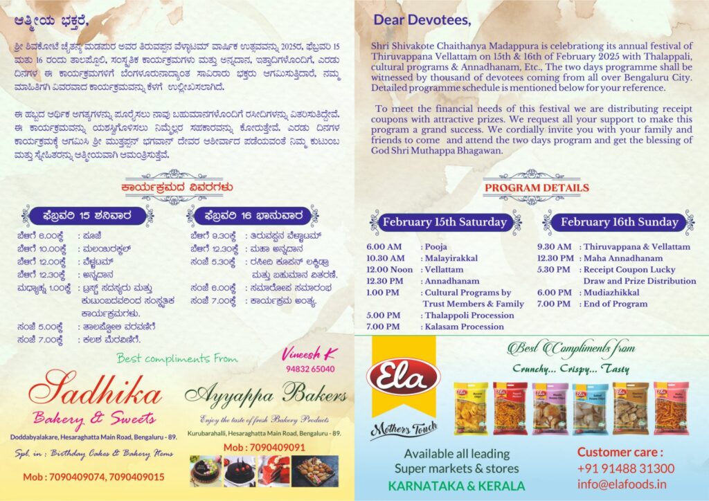 ഫെബ്രുവരി 10ന്, രാവിലെ 5മണി മുതൽ 9വരെ, പ്രതിഷ്ഠ ദിന പൂജകൾ, മഹാഗണപതി ഹോമം, എന്നിവ നടക്കും. ഫെബ്രുവരി 15ന് ശനിയാഴ്ച രാവിലെ 9മണിക്ക് ഉത്സവത്തിന് കൊടിയേറും. 10മണിക്ക് മുത്തപ്പനെ മല ഇറക്കൽ, 11മണി മുതൽ മുത്തപ്പൻ കൊടുമുടി പുറപ്പാട്, ഉച്ചയ്‌ക്ക് പ്രമുഖ കലാകാരികൾ അവതരിപ്പിക്കുന്ന നൃത്തപരിപാടികൾ, വൈകുന്നേരം 5.30ന്, ചിരപുരാതനമായ ശിവകോട്ട ലക്ഷ്മീ നരസിംഹ ക്ഷേത്രത്തിൽ നിന്നും, പഞ്ചവാദ്യമേളത്തോട് കൂടിയ താലപ്പോലി ഘോഷയാത്ര, കലശം വരവ്, എന്നിവ നടക്കും.