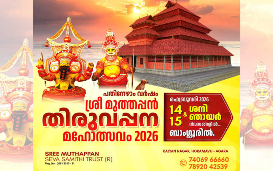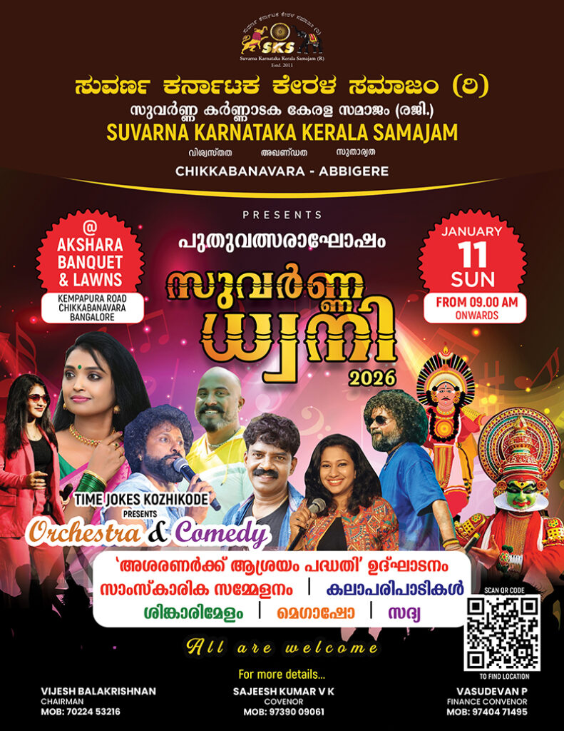 സുവർണ്ണ കർണാടക കേരള സമാജം ചിക്കബാനവാര-അബ്ബിഗ്ഗരെ സോണിൻ്റെ പുതുവത്സരാഘോഷം ‘സുവർണ്ണധ്വനി 2026’, ജനുവരി 11 ഞായറാഴ്ച ചിക്കബാനവാര, കെമ്പാപുര റോഡിലുള്ള അക്ഷര ബാങ്ക്വറ്റ് & ലോൺസിൽ വച്ച് വിവിധ പരിപാടികളോടെ ആഘോഷിക്കും.
