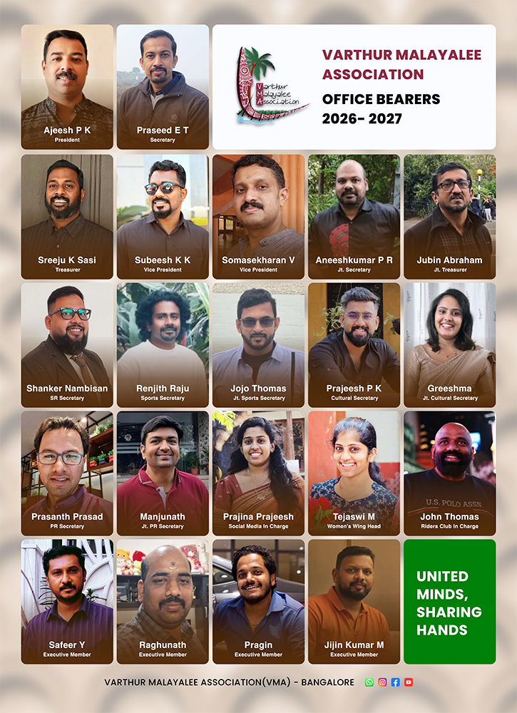 വർത്തൂർ മലയാളീ അസോസിയേഷൻ വാർഷിക ജനറൽ ബോഡി യോഗം മാർച്ച് 22ന് ദിശ വിൻഡ്സർ ഗാർഡൻ അപ്പാർട്മെൻറ് ക്ലബ് ഹൌസിൽ വച്ചു നടന്നു. പ്രസിഡണ്ട് ഷാജി രാജൻ അധ്യക്ഷത വഹിച്ചു. ജനറൽ സെക്രട്ടറി പ്രസീദ് പ്രവർത്തന റിപ്പോർട്ടും ട്രഷറർ നീതു സാമ്പത്തിക റിപ്പോർട്ടും അവതരിപ്പിച്ചു. അടുത്ത പ്രവർത്തന വർഷത്തേക്കുള്ള 21 പേരടങ്ങുന്ന എക്സിക്യൂട്ടീവ് കമ്മിറ്റിയെ യോഗം തിരഞ്ഞെടുത്തു. ഭാരവാഹികൾ: അജീഷ് പി കെ (പ്രസിഡണ്ട്), പ്രസീദ് ഈ ടി (ജനറൽ സെക്രട്ടറി ), (ശ്രീജു കെ എസ് (ഖജാൻജി)